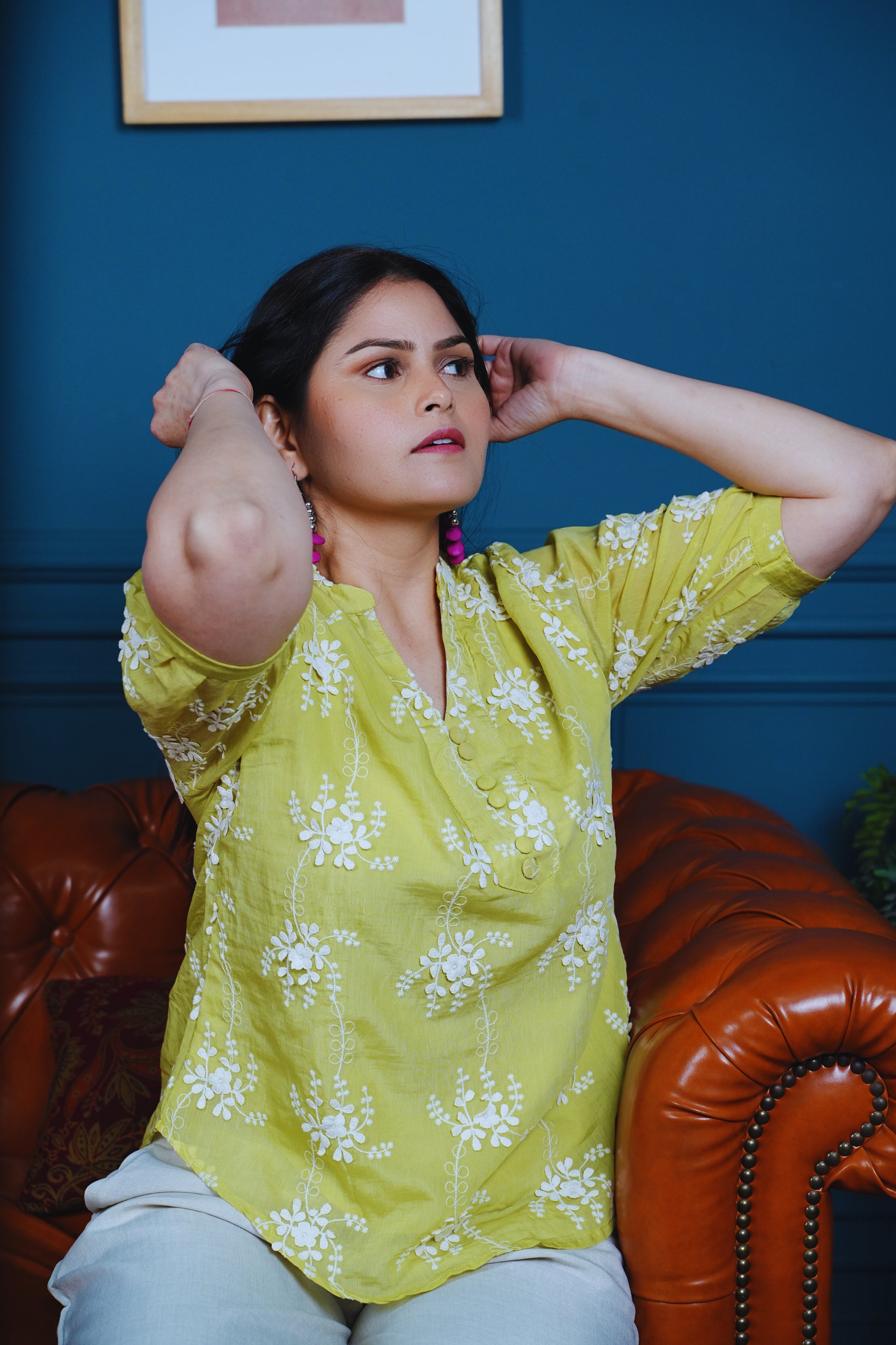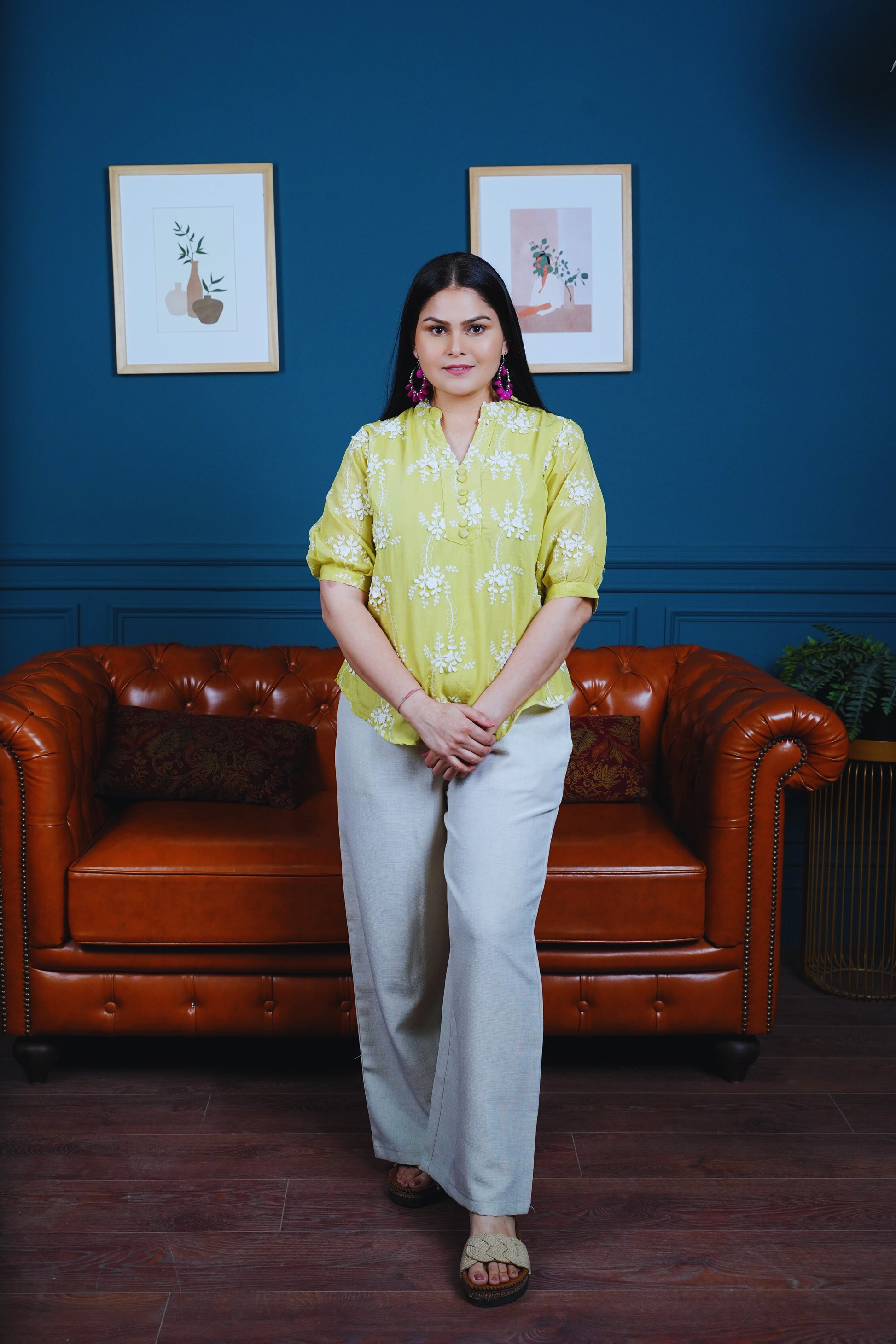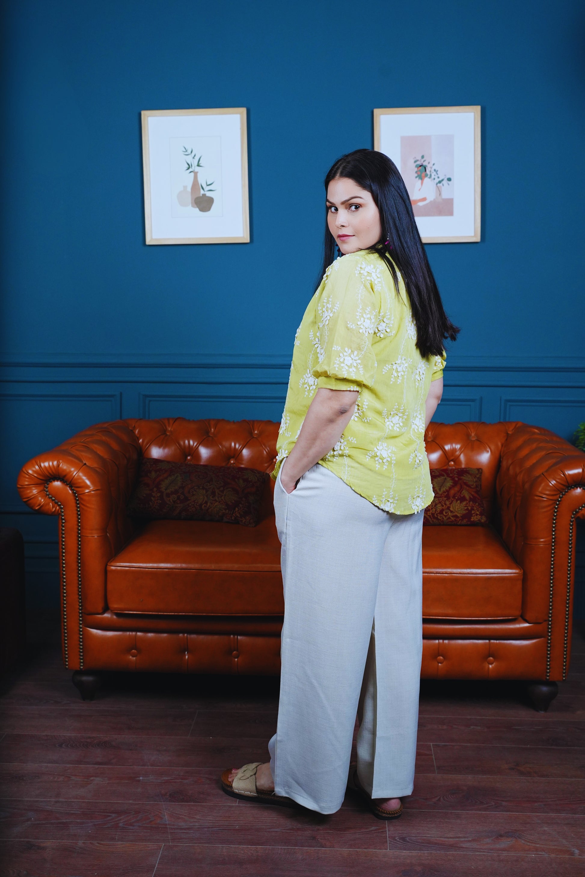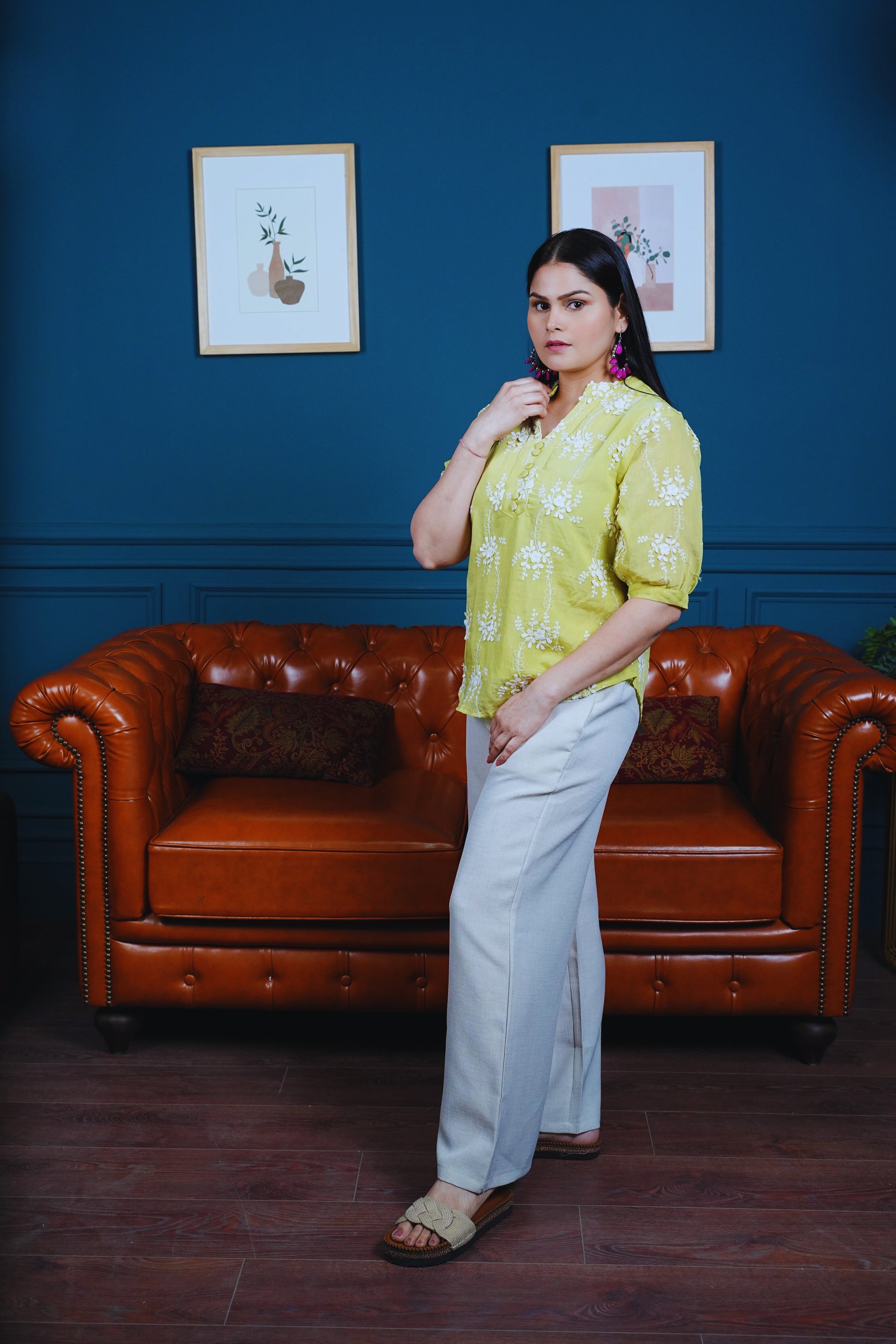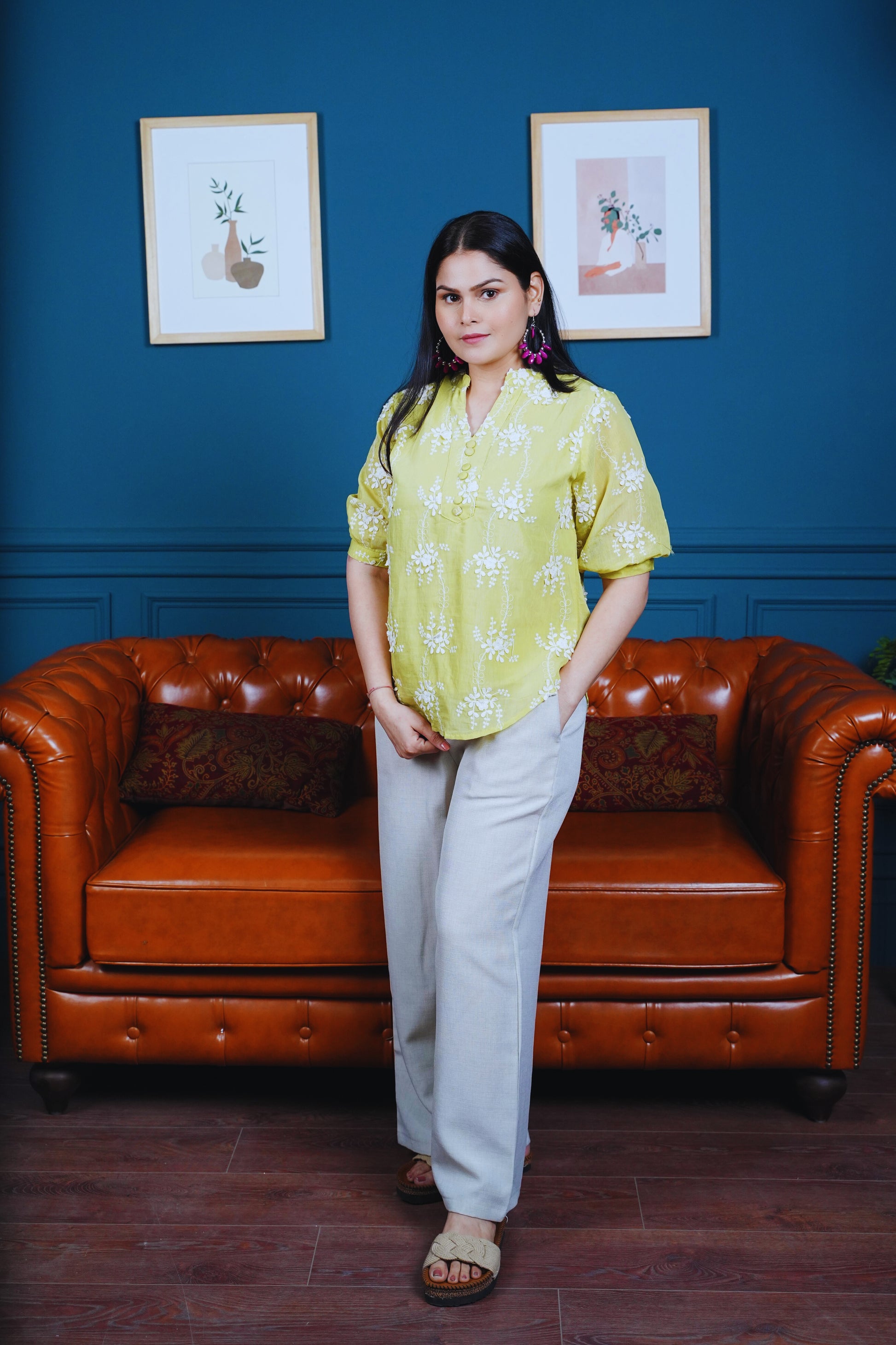 Step into effortless elegance with our Bloom & Ease Avocado Co-ord Set, crafted in a soothing avocado green hue that blends comfort with chic minimalism. The half-sleeve top features a curved hemline, V-neckline with Mandarin collar, and a delicate 3D white floral detail that adds a touch of artistry. Paired with natural linen pants with functional pockets, this co-ord is breathable, versatile, and perfect for all-day wear.
