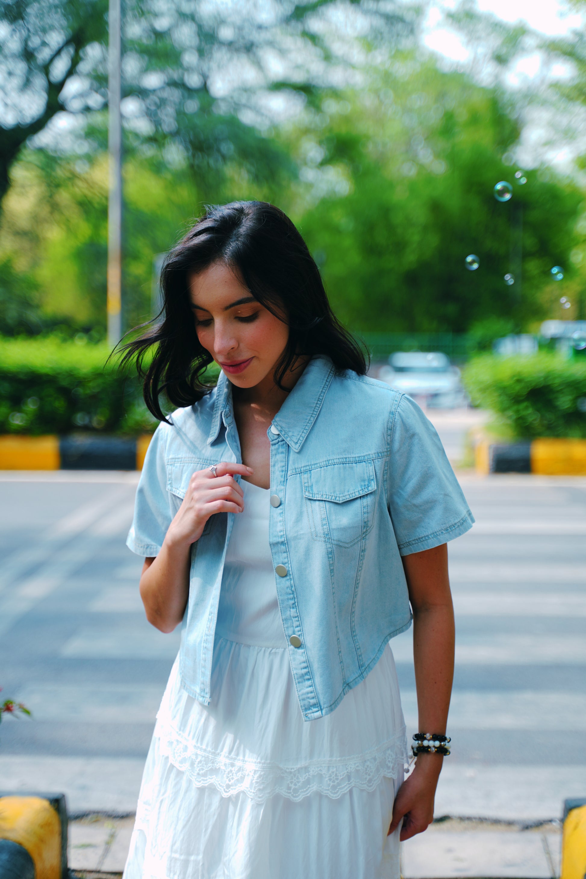 Cloudlight Muse Dress Set – White Tiered Maxi with Cropped Denim Shirt