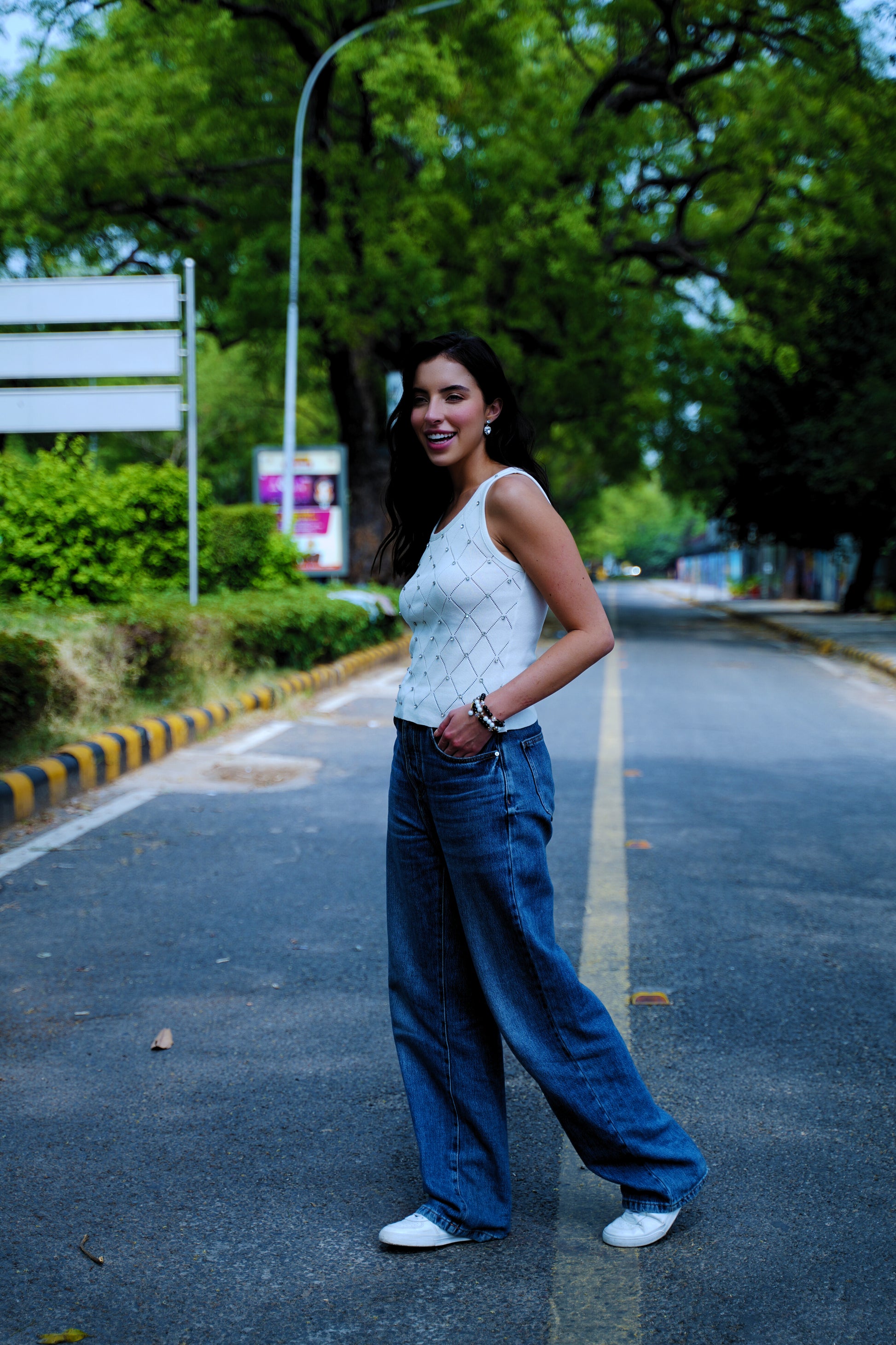 Turn basics into statements with our Diamond Dust Racerback Tank – a wardrobe essential elevated with thoughtful detailing. Crafted in soft, breathable white knitted fabric, this tank features an intricate diamond-shaped pointelle pattern and delicate stone hand-tucked accents that catch the light with every move. The racerback cut flatters your shoulders and layers effortlessly under jackets or stands out solo. A subtle sparkle for everyday looks, this piece blends comfort with an edge of glam.