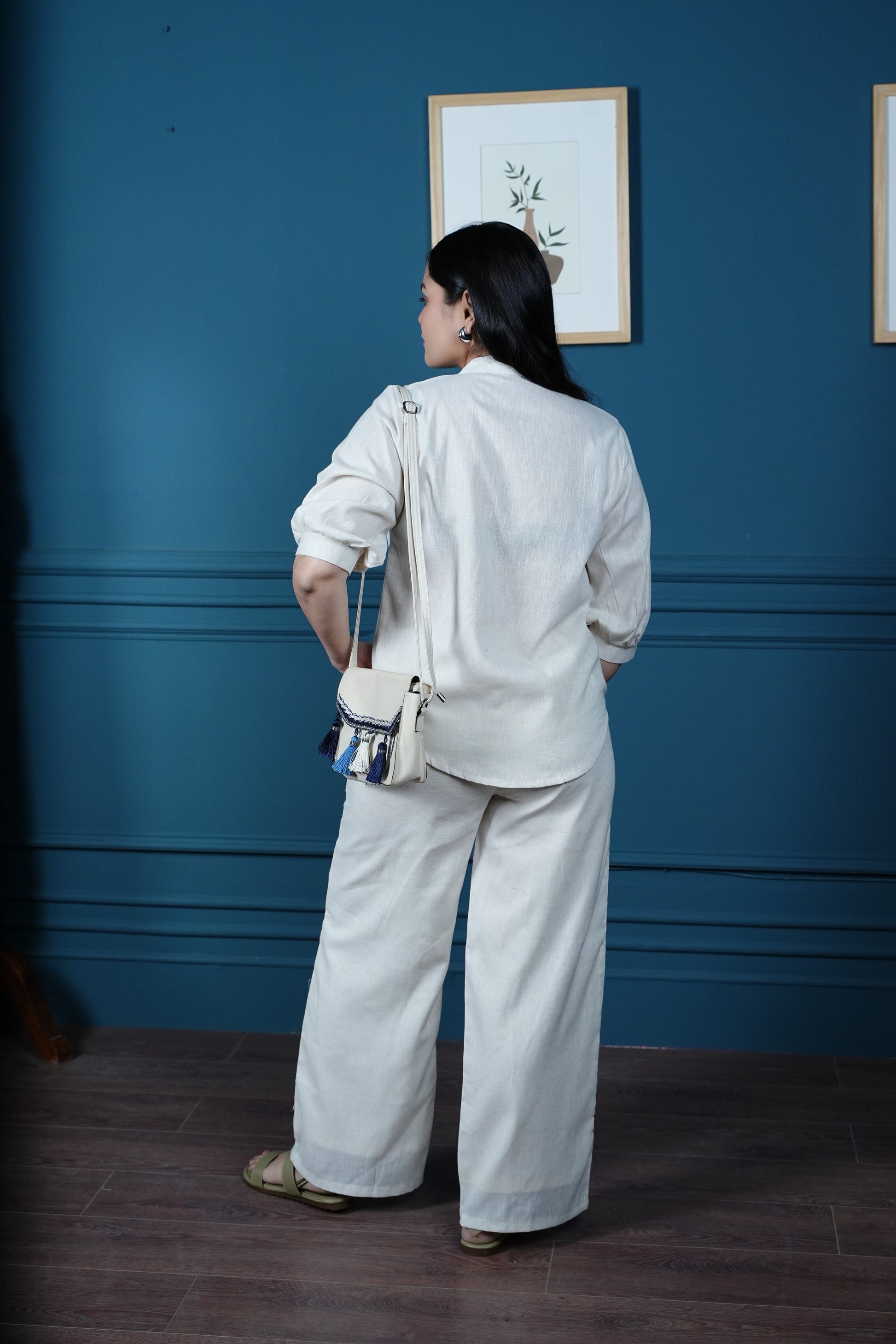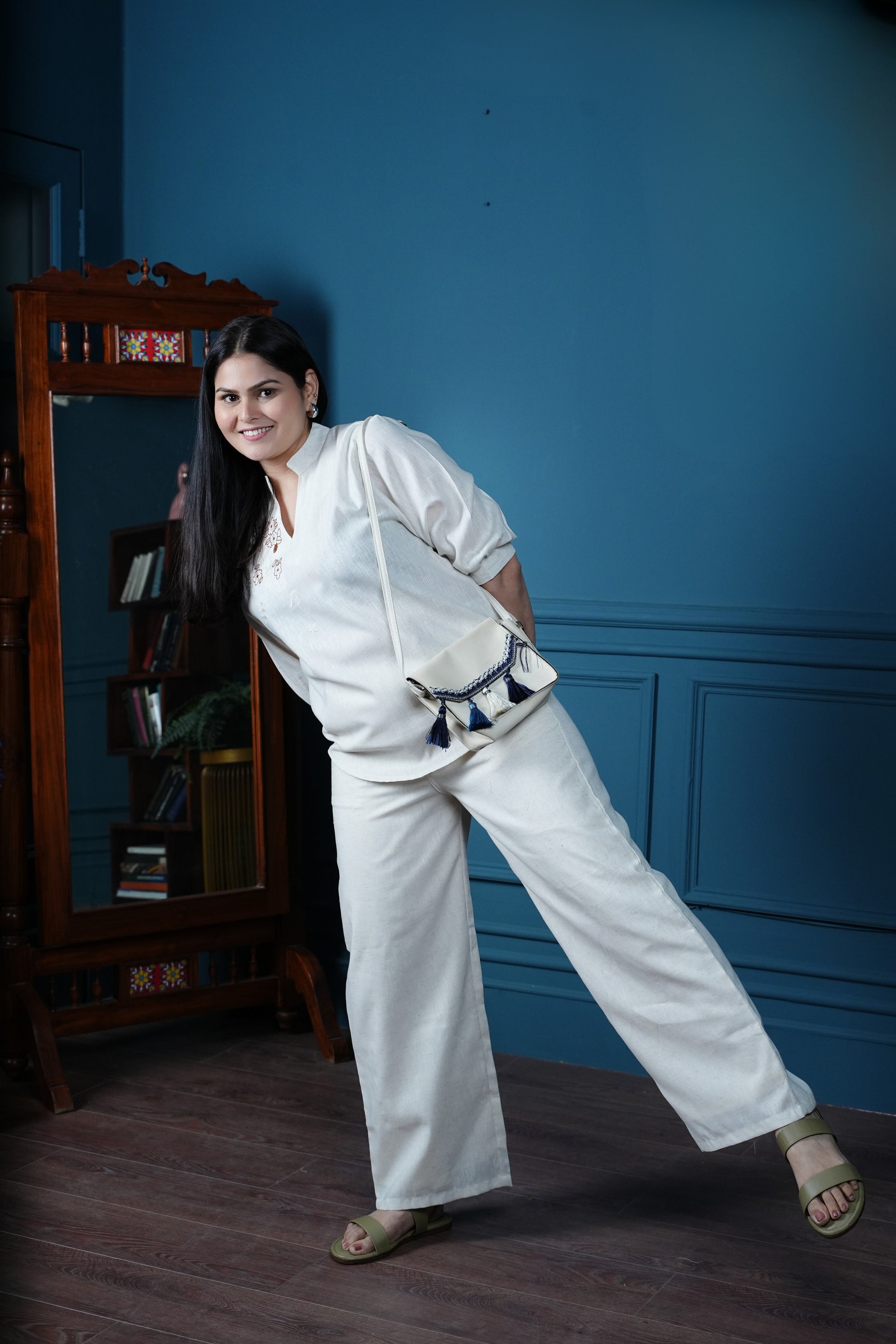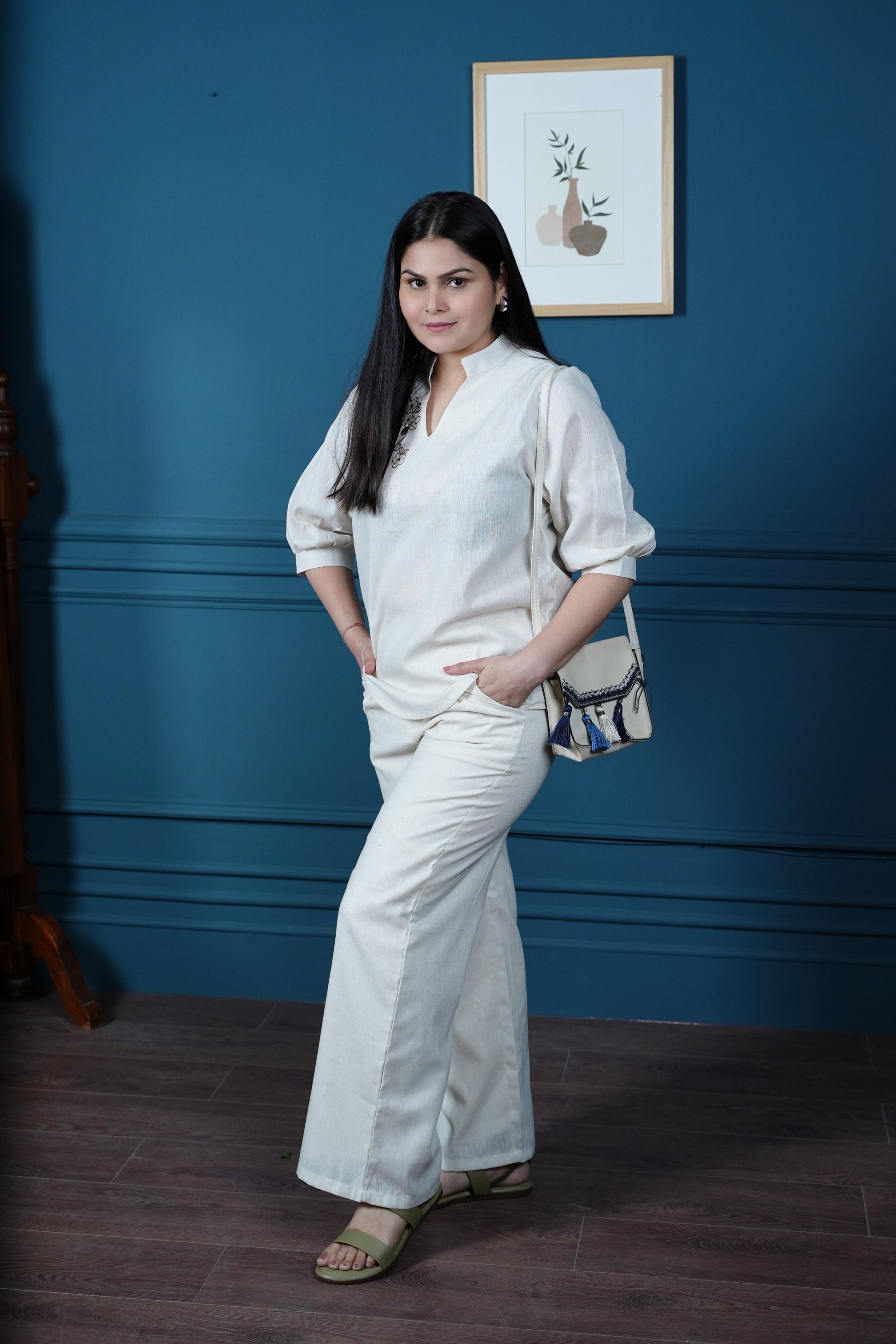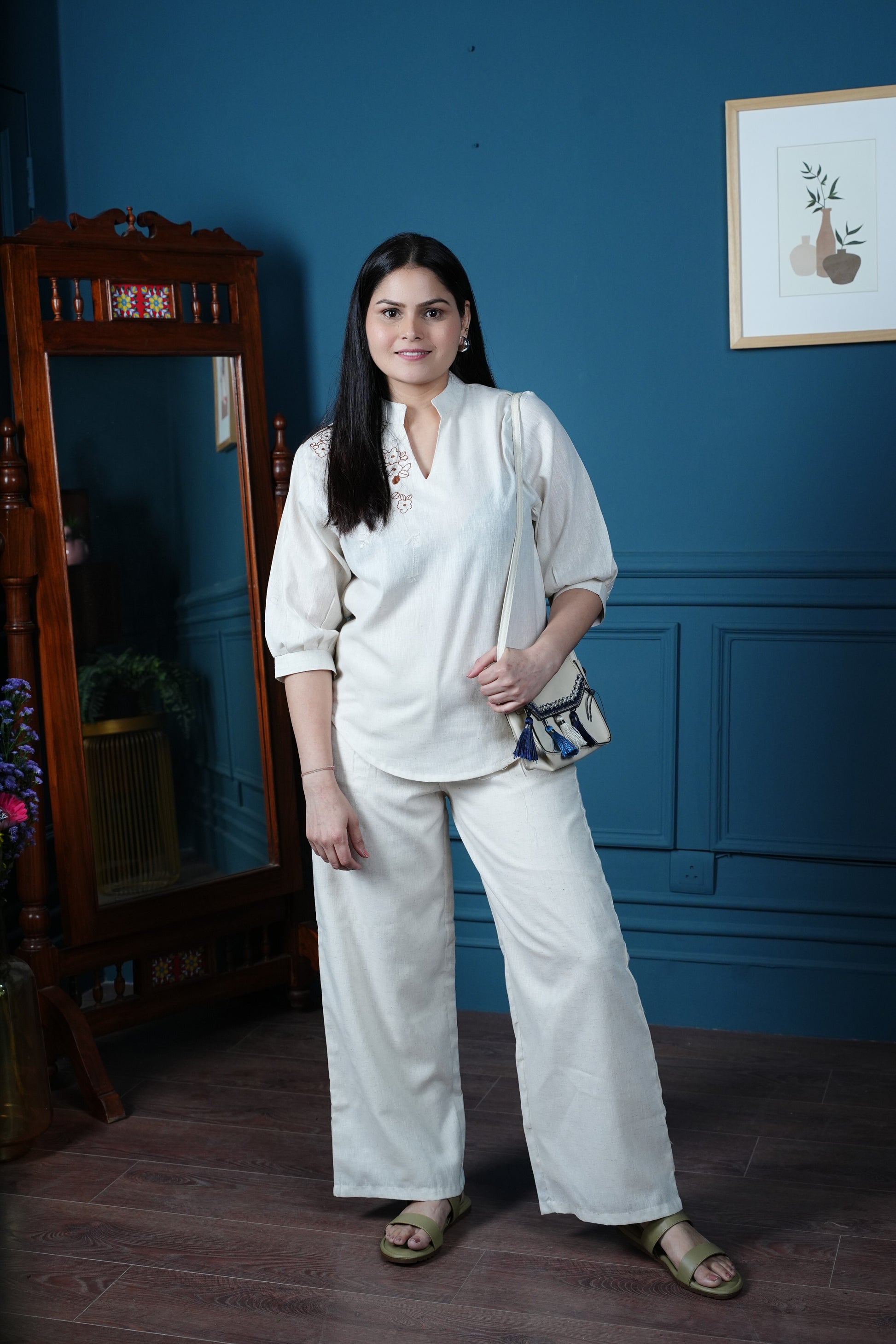 Discover understated elegance with the Ethereal Bloom Cream Co-ord Set. The half-sleeve top, crafted in a soft cream tone, features a V-neckline with Mandarin collar, a curved hemline, and floral placement embroidery on the shoulder that adds a graceful accent. Paired with matching pants with functional pockets, this set is designed for a relaxed yet sophisticated fit.
