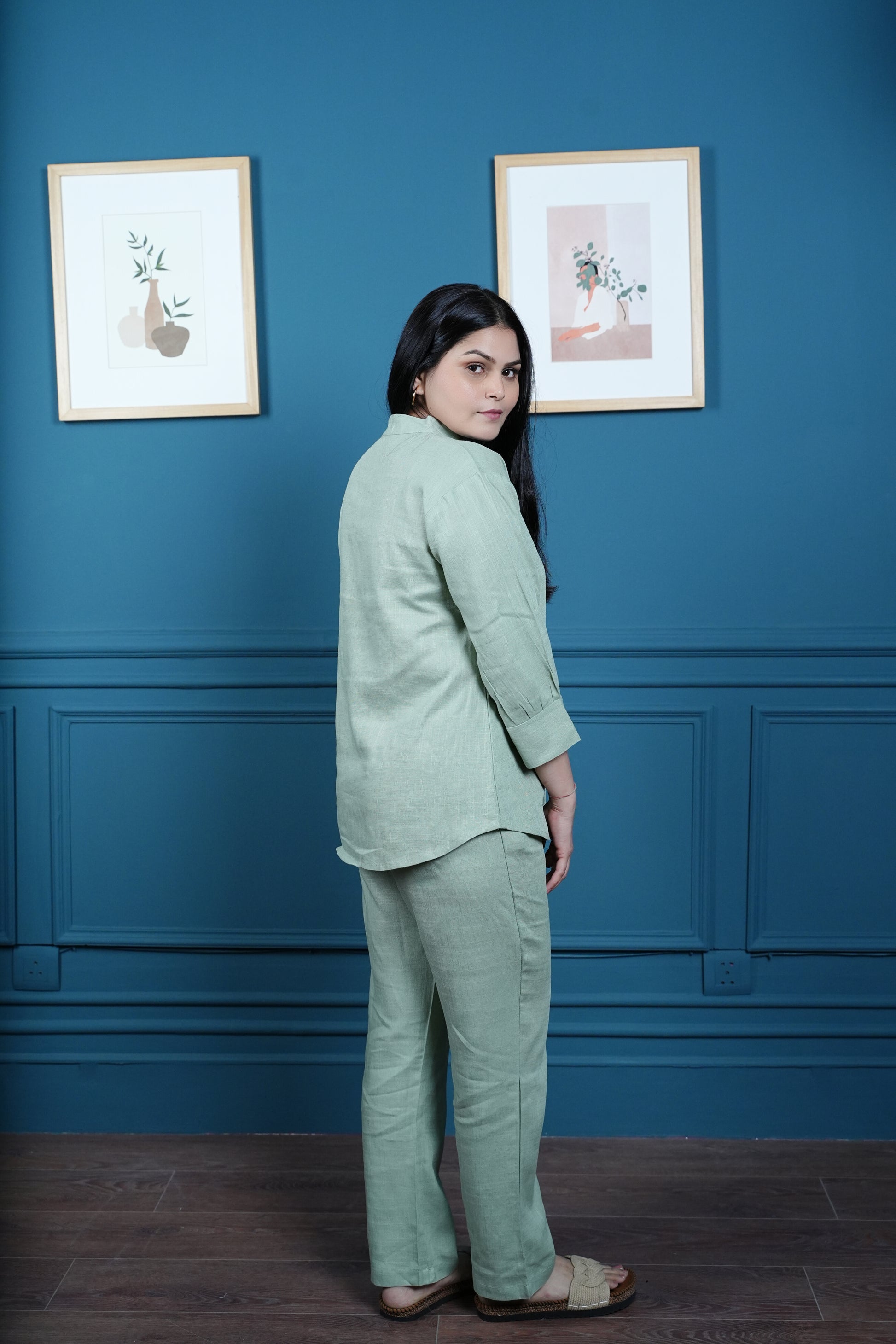 Refresh your wardrobe with the Mint Jade Grace Embroidered Co-ord Set, a perfect mix of comfort and elegance. The button-down shirt in a soft mint jade tone features a Mandarin collar with V-neckline and is adorned with ric rac lace floral motif embroidery, adding delicate detail to a breezy silhouette. The set is paired with matching pants with pockets, designed in natural fabrics for all-day ease.