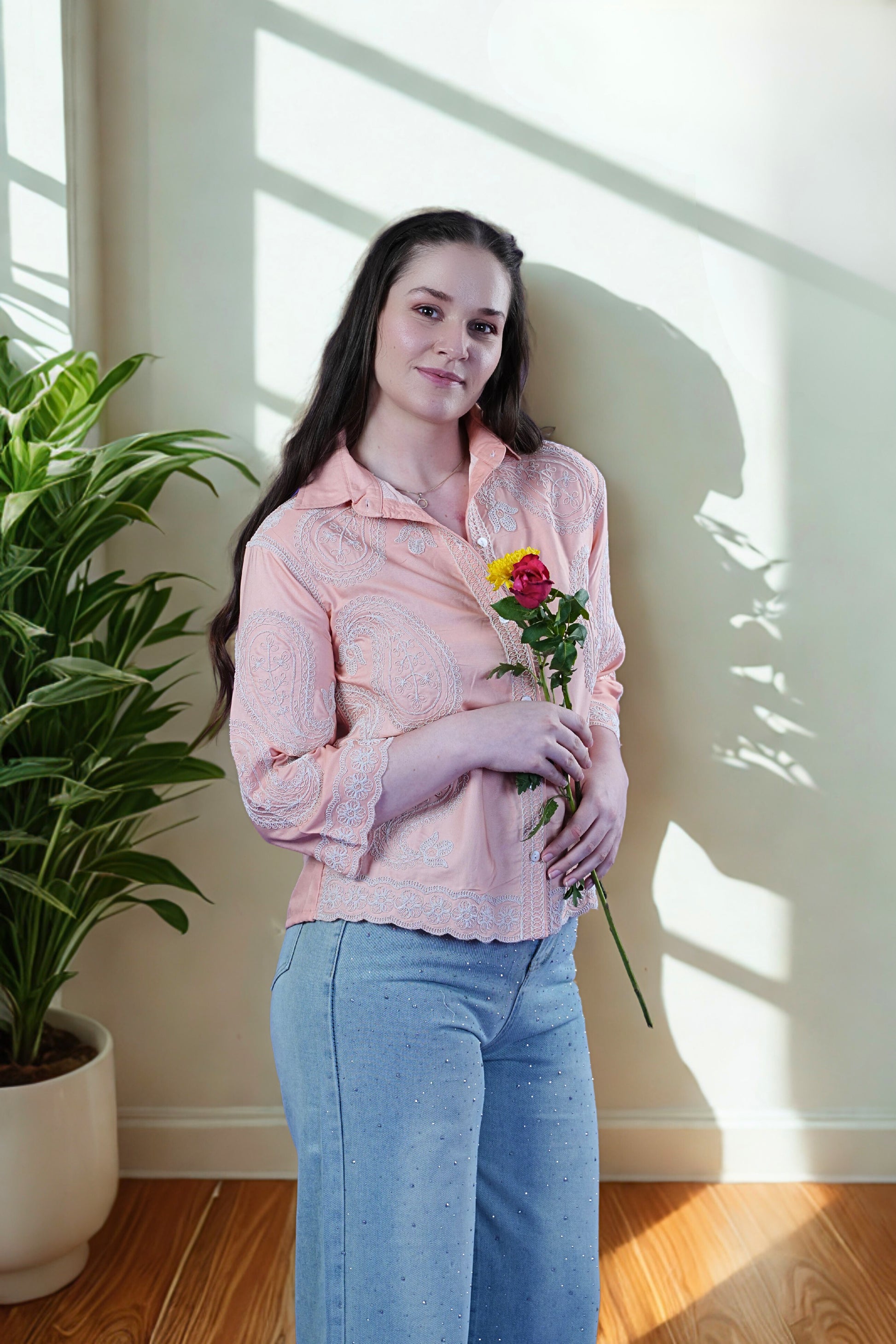 The shirt collar, front-open button detailing, and quarter sleeves give it a structured yet gentle charm—perfect for elevating your everyday style with a touch of handcrafted warmth. Feminine, fresh, and effortlessly graceful.
