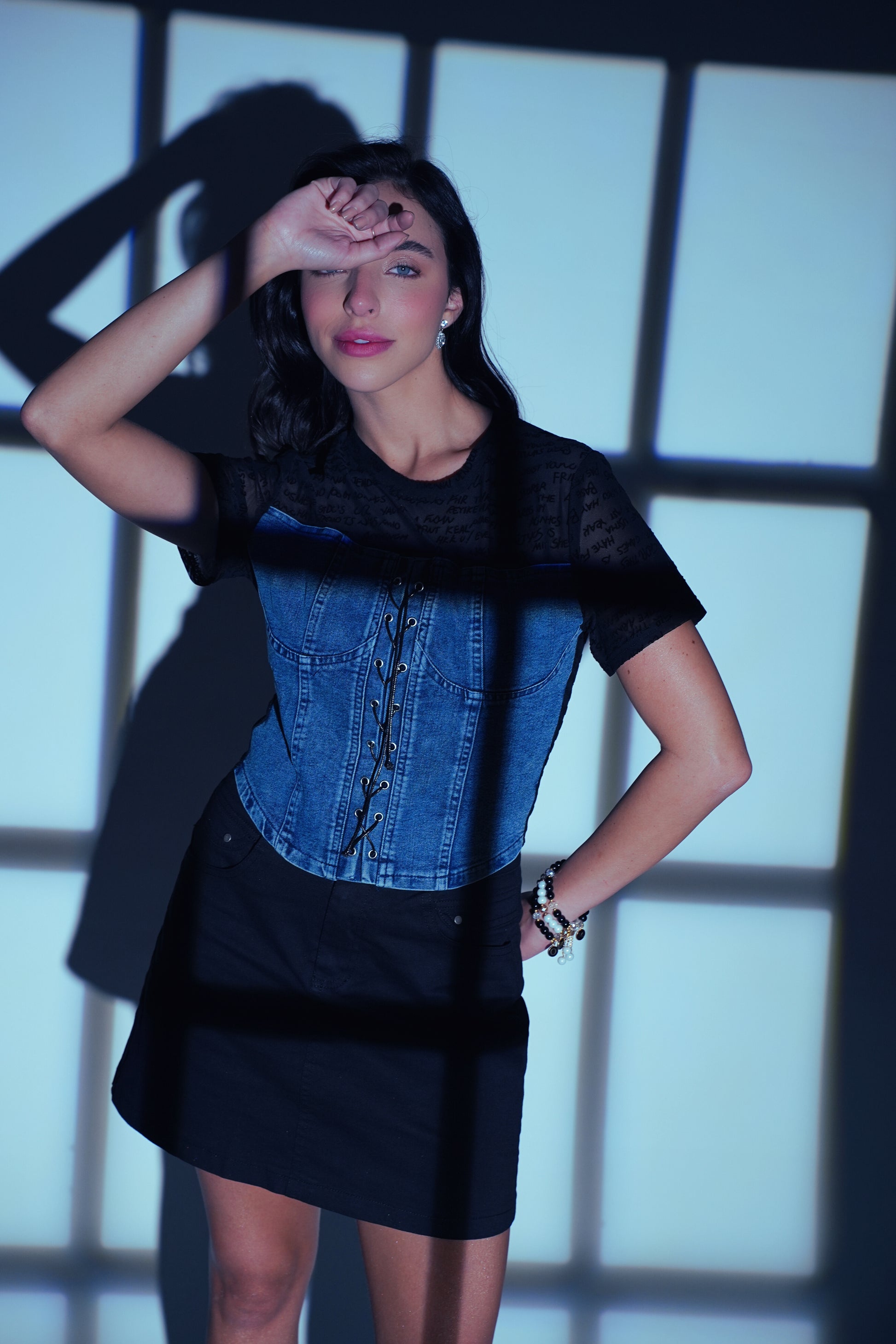 This top brings structured snatch in the front with a criss-dori corset vibe, and pure mesh madness in the back with bold typography that speaks louder than DMs.