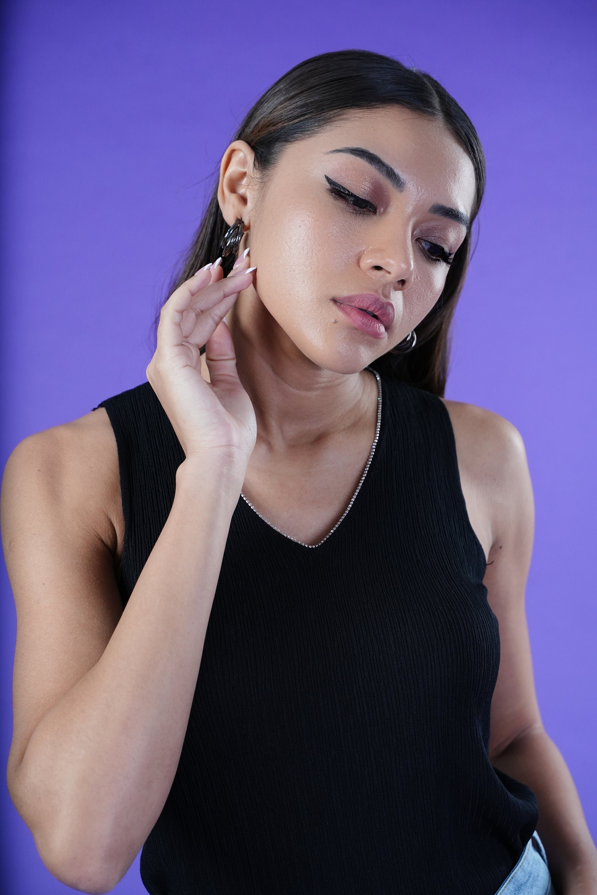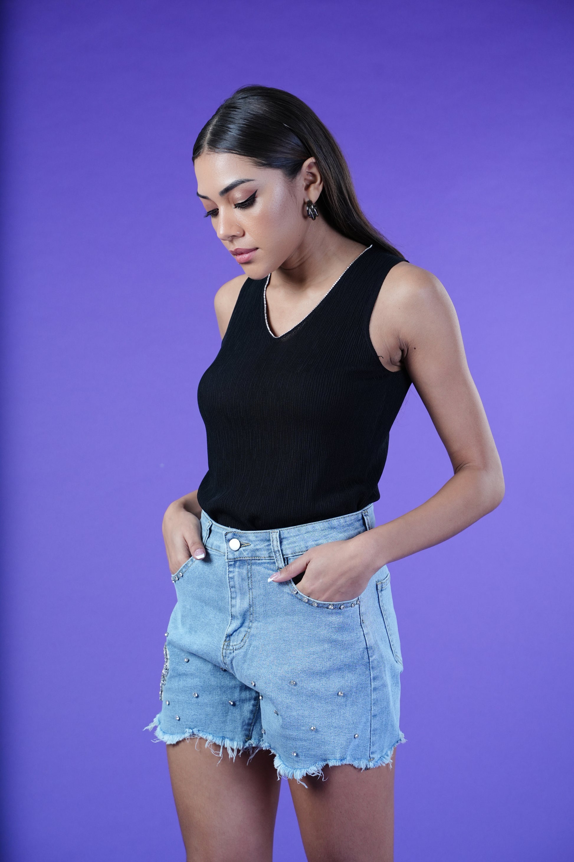Step into effortless glam with the Vixen Glow Rhinestone Tank. Crafted in a sleek black ribbed fabric, this tank hugs your silhouette with a flattering stretch while keeping you ultra-comfortable yet chic. The highlight: a shimmering rhinestone chain tracing the V-neckline, adding the perfect touch of sparkle that elevates even the simplest outfit. Chic, versatile, and irresistibly glam — this tank is your new go-to for nights out, brunch looks, or layering under your favourite jackets.