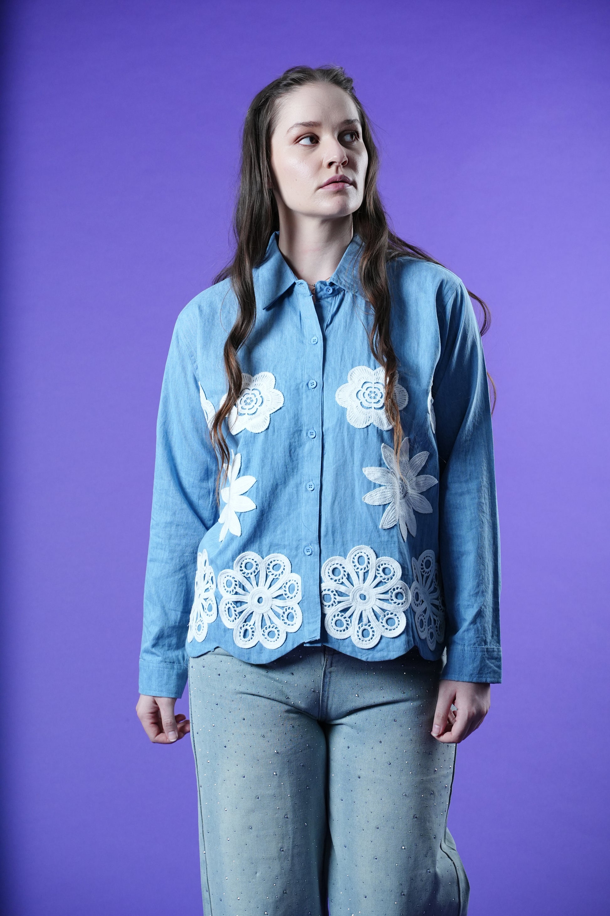 Meet the shirt that feels like sunshine stitched into denim. The Wildflower Muse Denim Shirt is crafted in classic blue denim and elevated with a delicate crochet flower patch, adding a soft, handcrafted charm to an everyday essential. Designed with a shirt collar, button-down front, and a clean button-opening placket, this piece balances structure with free-spirited detail. Easy to wear yet full of personality, it’s made for days when you want your outfit to feel effortless, expressive, and a little bit poetic.