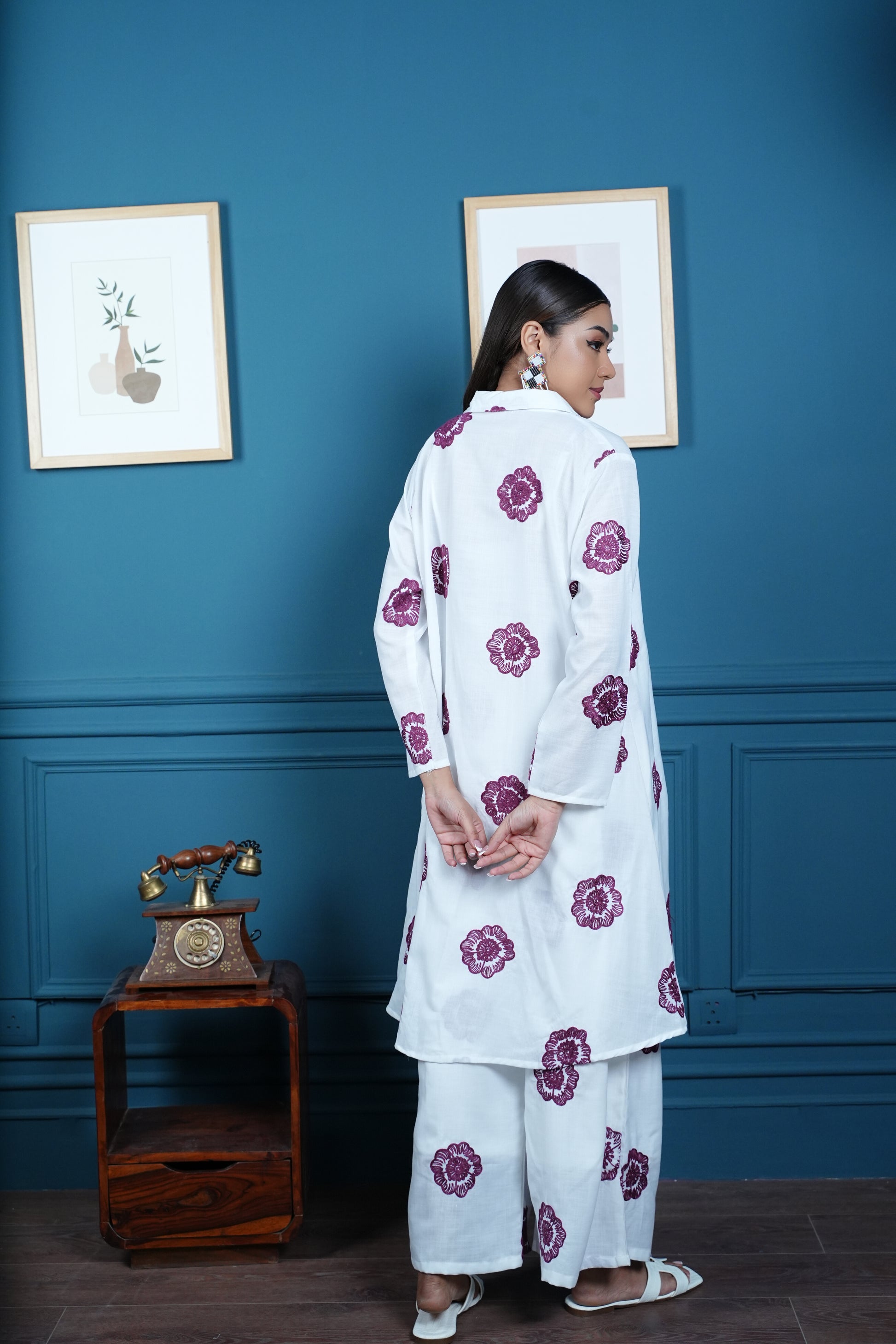 Step into effortless elegance with our Wine Whimsy 3-Piece Co-ord Set. A playful yet sophisticated outfit, it features a smocked-back cropped bustier, wide-leg pants with pockets, and a breezy front-open long shrug. Crafted in a dreamy white and wine palette, the set is adorned with cute floral embroidery all over, adding a touch of romance and whimsy.